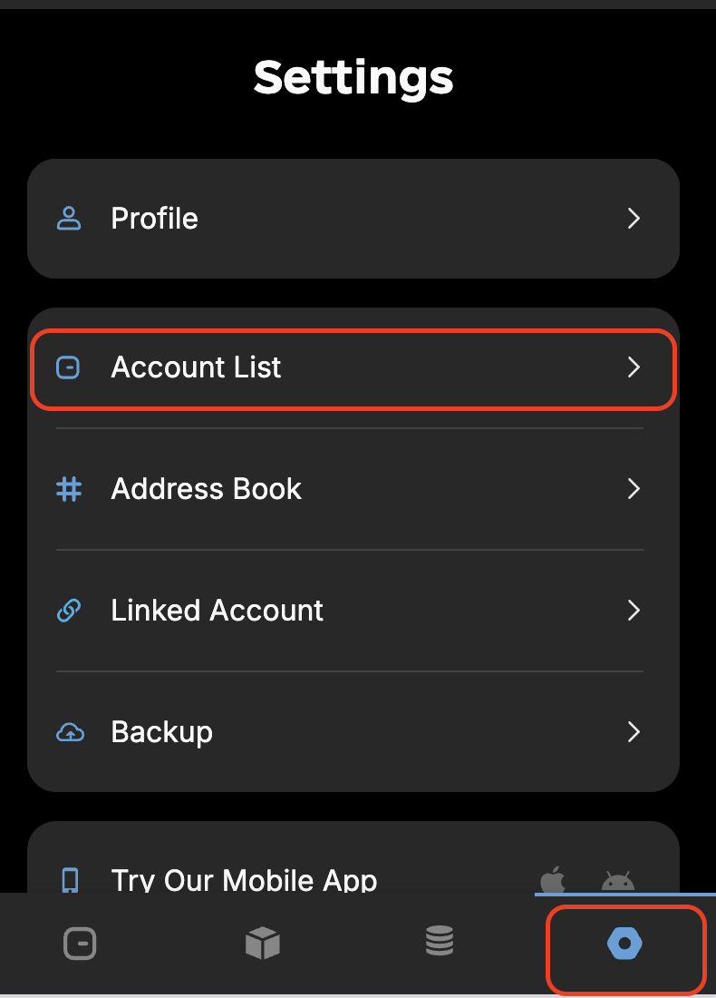 1. Open the Flow Wallet Extension and navigate to the Settings page. Select the "Account List" section to view your accounts.