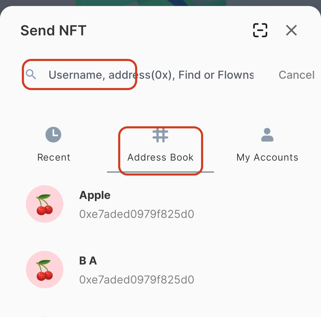 Step 2: Enter the recipient's COA/other Flow account address, otherwise you can choose recipient's address you already save in address book .